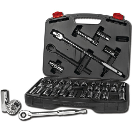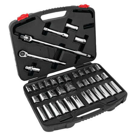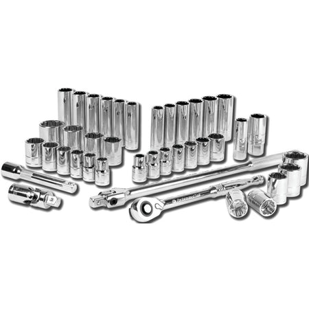 Gear up for exceptional performance with our Performance Tool W32905 40-piece 1/2" Dr. Mechanic's Socket Set. Featuring a high torque quick-release ratchet with 108 gear teeth provide and a precise 3.3-degree sweep. Engineered of chrome vanadium alloy steel, this set boasts exceptional strength and durability. The versatile socket assortment includes standard and deep wall options, covering a wide range of SAE and Metric sizes. Convenience and organization are key! The included durable storage case ensures easy transportation and storage. Whether you're a professional mechanic or a DIY enthusiast, this comprehensive socket set is an indispensable tool for tackling any automotive task with confidence. Its superior construction, diverse socket selection, and ergonomic design make it the perfect choice for demanding environments. Invest in the Performance Tool W32905 40-piece 1/2" Dr. Mechanic's Socket Set today and elevate your automotive projects to the next level of precision and efficiency.