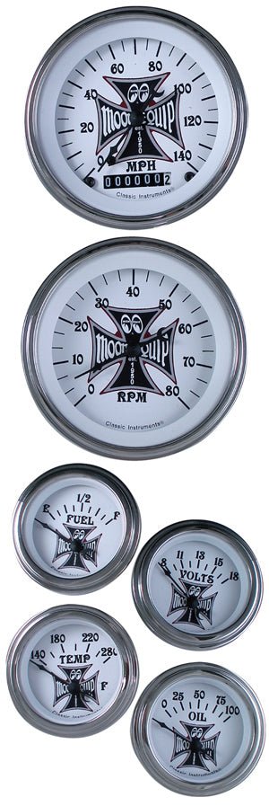 This 6-gauge set features the MOON Equip. "Iron Cross" design on the face of each gauge and includes two (2) 3 3/8" diameter gauges and four (4) 2" diameter gauges. All gauges are electric and include all senders. Sold in set of six only.